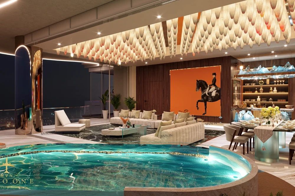 A lavish lobby greets residents with elegance — tall glass walls, warm lighting, and refined textures set the tone for everything that follows.